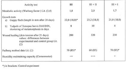 We developped grain-placenta preparations, gained from grain carpel brans, incl aleuron proteins, directly and/or via cell culture, under patent protection since 2003 (11a). Concerning rye-placenta cf illustrations 1a/b and Table 6. The vegetal placenta extracts are able – like the animal ones (12-14) - to increase cell metabolic activity (cell stimulation). This has been proven for rye placenta extracts in WARBURG experiments (Table 7) and in growth tests as metamorphosis acceleration of tadpoles (Table 8).