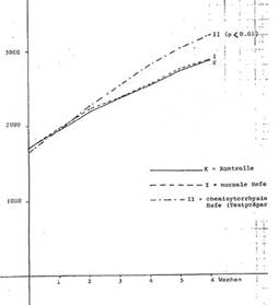 A few examples of the cytorrhysates described in this patent specification are: Chemicytorrhysates on the basis of wine yeast, baker's yeast and bottom yeast (8 : 90 : 2) show a remarkable plant growth promoter effect as presented in 17 photographs in the patent specification: (5a,c); cf. also ref (18). Chemicytorrhysate based on Saccharomyces cerevisiae reduces the consumption of feed: growth effectiveness (rabbits): Tab 1 and 2, Diag 1 (next page) As mentioned above the sexuality of male mice can be inhibited by yeast (statistically guaranteed). Under the influence of one of the cytorrhyzed yeast mentioned in VI 3 (not revealed here) 10-20% compensation of the inhibition was observed in the following serial experiments, each time with 5000 mice (1000 males with inhibited sexuality). Tab 1: Growth experiments on rabbits ♂ (body weights in g)