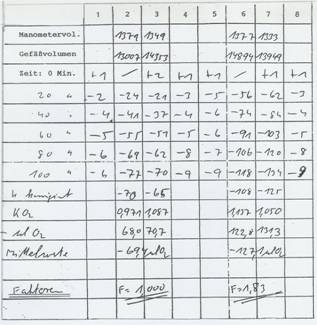 Table 7: Record of the WARBURG-factor determination Result: factor for rye placenta extract: 1,83 – control set to 1,0 (pre-incubation time 1 hour at 37°C)