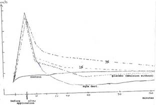 Key to Diag. 3a: The initial skin value (control) is almost constant. Aqua dest. shows clear “drying out” after approx 30 mins. The emulsion without COLLAPLANT PO gives 40-60 minute values that fall slightly below the initial skin values in the “drying out zone”. The moisture-retaining effect lasts over two hours with the 1% water/oil emulsion. With the 3% emulsion a clear increase of the initial skin value is discernible even after 120 mins.