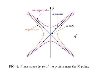 the motion of the un-trapped particle along the positive direction of q, i.e., ( Consider a motion of particle near the X- point more in a detail (see Figure 5). A particle slows down