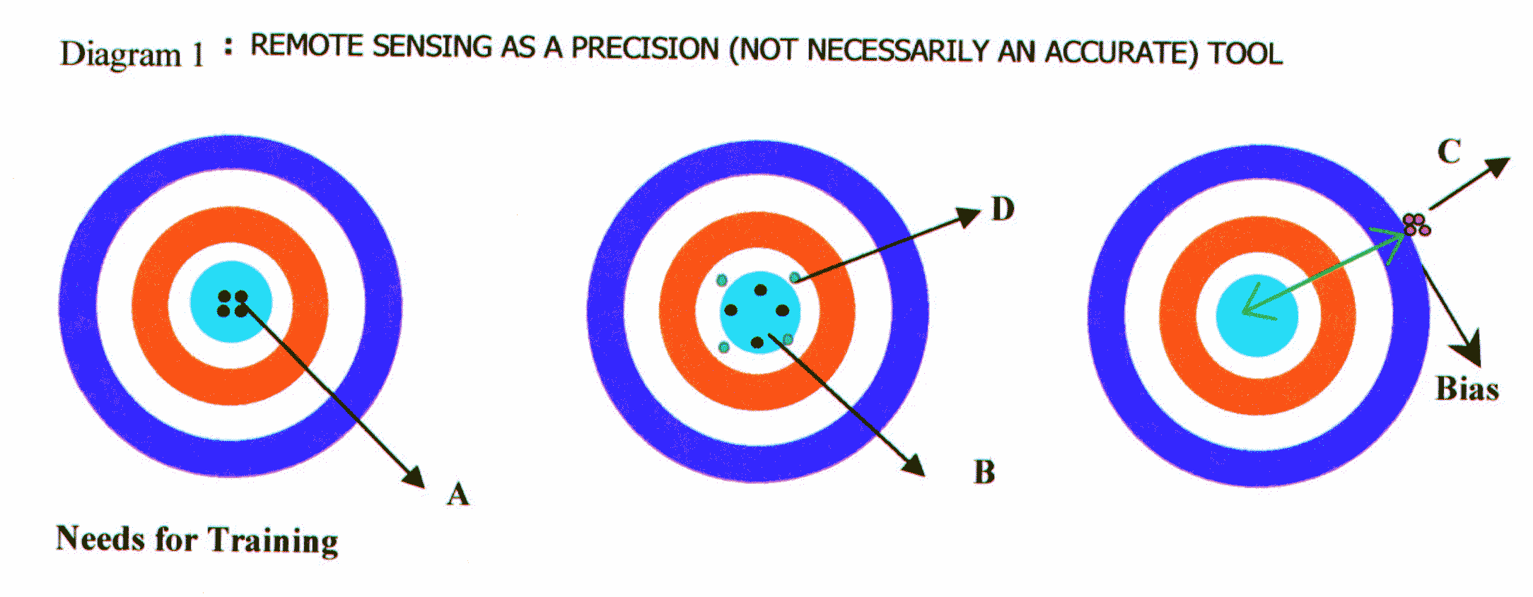 Relevance Conventional methods in each area of application have error of analysis and if adopting Remote Sensing, GIS and GPS technologies could reduce this range of error, then the new technology becomes meaningful as well as relevant. How accurate the input data should be (from new technology) for a given application objective could be visualized with the example of a practicing doctor. Though technology for measurement of temperature has undergone much advancement (example: consumer goods manufacturing industries), the mercury thermometer of doctor having a least count of 0.1 F has not changed. As after a threshold of 100 F, the medicines (at first prescription) will not get changed even if temperatures is 101 or 102F, may be frequency of dose may increase. Thus 1F is error of analysis with reference to under-standing of human body processes. Thus the Doctor has right for 10 times better input data i.e. 1/10F i.e. 0.1F.Now in conventional measurements based analysis in any application area, if the same data sets are given to say 10 different groups of users, the analysis and recommendation given by these 10 groups would differ widely. This range of variation speaks about the inherent uncertainty in synthesizing and analysis, which speaks about the gray state of skill and knowledge in the particular application discipline. Could use of Remote Sensing, GIS and GPS technologies reduce the uncertainty range and gives input data, which are at least ten times better than error of analysis. The answer would be yes. Requirements for spatial and radiometric resolutions could also be worked out in this manner. This way the trainee having good subject knowledge and field experience is motivated to overcome the potential barriers with reference to “don’t-know” ( lack of knowledge—cognitive aspect) , “Can’t do” (lack of skill-behavioral aspect). And, the desire/goal to overcome the psychological barrier “won’t do” situation needs to be achieved by practicing affective learning. This motivation is created with exploratory exercises of interpreting a false color composite together with the relevant toposheet after a brief initiation on the first day of training itself. It has to be made clear that hold on natural happenings cannot be improved by creating more and more data inputs. Improvement comes only by reducing error of analysis. Image form data analysis reduces the range of individual’s variation and makes the process of analysis precise. The concept of precision can be explained with the diagram 1. This diagram indicates the three different situations of firing of bullets in a firing range. The shooter ‘B’ is accurate but less precise than ‘A’ and ‘C’. Precision is the capability to repeat the operation and lower the spread of repeated firings more the precision. ‘C’ would have better capabilities to kill a flying bird than ‘B’ provided the gun used by him is mechanically modified by giving offset to viewing/aiming devices as described by bias (a constant appearing in all statistical and mathematical equations). The shooter ‘D’ has no chance of becoming useful. The precision available in Remote Sensing, GIS and GPS technologies is the real strength for getting recognition among scientist working in diversed application areas.
