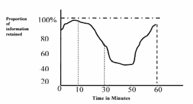 ![]() Diagram-3: Schematic Representation of Trainee Retention Capacity. A trainee can have limited retaining capacity in the short-term memory for 5-30 seconds and thereafter the information is forgotten. Diagram 3 gives the graph describing the retention capacity of trainees. Here, making lecture in familiar surroundings and introducing in a manner to ensure learning in context could shorten critical period of warming up of mental activity to maximum to 10 minutes. The diagram 3 indicates that first 30 minutes are most favorable for learning and thus these should be used to present important points. These 30 minutes could be lengthened by Encouraging active participation Suitable learning environment (e.g.) reasonably cool circulation of fresh air and avoidance of direct sun- light (whole of the training area at NRSA training center is centrally air-conditioned with sun shields on glass panes and additional protection is provided through venetian blinds) Using visual aids and demonstrations Giving handout on major events Higher retention can be achieved by emphasizing key points, repeating wherever possible and by using visual aids to provide second medium of communication for key points. To cater to wider and heterogeneous entry behavior of trainees, trainer has to tune the delivery by using the principles of must, should and could (diagram 4). Normally trainer has to practice must (core learning) and should (the possible content which helps to put the learning in context). To satisfy the inquisitiveness of trainees with engineering and physical sciences background, trainer could sometime venture into could (providing of interesting background information). Thus during training there is a need to concentrate on the critical learning areas (Must)—those elements that provide the essential basis on which to build later.