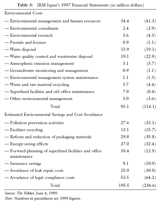 Environmental Liabilities. By the American 96–1: Environmental Remediation Liabilities. As for Regulation S-X, the US Securities and Exchange Commission (SEC) demands disclosure of total potential environmental costs, and analysis and disclosure of serious effects, serious concerns, disputes, and undecided matters of administrative accountability, and anticipated trends and events in relation to environmental laws such as Clean Air Act, Clean Water Act, Resource Conservation and Recovery Act, and Superfund Act. In assessing corporate activities and accomplishments in terms of social and psychological risk, pollution risk, economic risk, and benefits ascribable to financial institutions, investors and consumers, what is crucial is quantitative financial analysis — in particular, cost-performance analysis and cost-effectiveness analysis. As a reference, Table 3 reproduces part of IBM Japan’s financial statements related to environmental issues. The more solid accounting standards are, the more easily account statements of corporations, industries and even nations can be compared, which will enhance reliability. In that sense, if we are to have healthy environmental accounting, we must first establish accounting standards that are widely acceptable on a global scale. If these standards prompt disclosure of environmental activities, they will help companies improve their environmental information assessment systems, while benefiting investors and users in environmental investment management. Thus, the society as a whole will be enriched and quality of life enhanced. The Japan Environment Agency (now the Ministry of Environment) published “A Draft Guideline for Measuring and Announcing Environmental Costs” in March 1999. According to this guideline, the costs of environmental conservation are classified as follows: (1) Direct costs for reducing environmental impacts; (2) Indirect costs for reducing environmental impacts; (3) Costs for reducing environmental impacts involved in usage and disposal of manufactured and distributed products; (4) Research and development costs for reducing environmental impacts; (5) Social costs for reducing environmental impacts; (6) Other costs related to environmental conservation. While costs are comparatively measurable, in general, it is not easy to measure benefits, effectiveness, and contribution. Commonly used concepts include savings effects, reduction effects, and opportunity costs such as cost avoidance. Even with such concepts, however, direct effects may be measured, but indirect effects or ripple effects are likely to be overlooked. ![]()