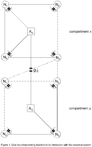 generalization of neuronal information processing: In the glial-neuronal compartments (x, y) the astrocytes (Aci, j)
