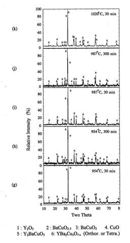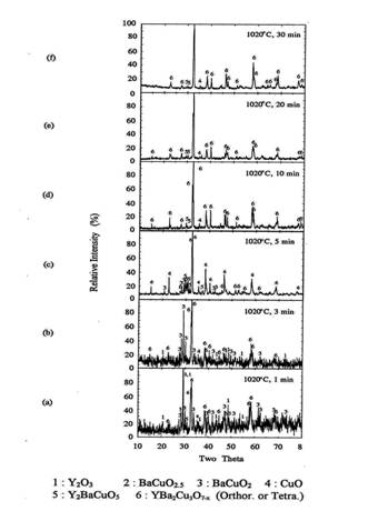 were remained as the major phase. After five minutes of reaction at 1020℃, orthorhombic Y123 was the