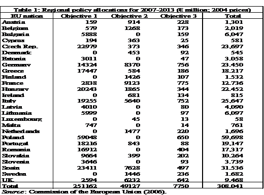 The EU has always deliberately extended most of its financial assistance to the very poorest areas; in practice those eligible under objective 1. This concentration process has been strengthened for the 2007-2013 period as can easily be seen in Table 1, which sets out the ‘indicative’ allocations for funding; indicative since the actual expenditures would depend on how the member states and regions actually spend the money during the period: about 82% of the total is objective 1 funding. For a sense of overall perspective, it should be pointed out that EU regional expenditure over the period 2007-2013 is expected to be 36% of the EU general budget, amounting to about €350 billion over the seven year period.