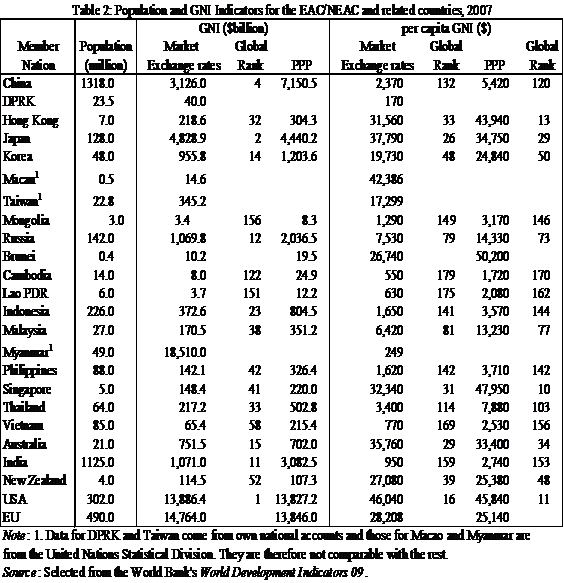 I should hasten to add that I am not suggesting that they should not try to form a PTA. Indeed, a PTA which includes the US would have great potential not only in economic benefit terms, but also for common security. The former because of the combined trade and FDI flows between them relative to all the nations mentioned in this context, the data for which are in the tables. The latter since, with China, together with Hong Kong and Taiwan, and the US being so involved, security efforts can be limited to dealing with problems emanating from DPRK.  Such a PTA should not be seen as undermining ASEAN+3, ASEAN+9 or the APEC forum since it simply means that these countries form a club of their own; after all, ASEAN is involved in all three. This may galvanize ASEAN into enhancing its own club and promote progress in all the countries concerned unless one is of the opinion an ‘oligopolistic’ structure may lead to indeterminate outcomes. I am therefore not trying to undermine the EAC or NEAC initiative; I am simply trying to stress the problems that have to be seriously faced in order to make it a reality.
