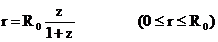 r=R0-R and velocity v, in terms of z (redshift),