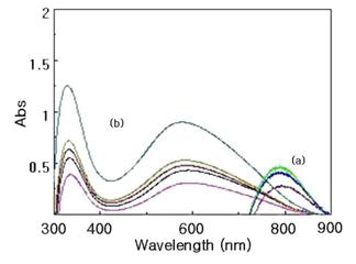![]() Figure 4. UV-Vis spectra of H2SO4-doped and NH4OH dedoped-polyaniline: a) The intensity of peak of PANi (salt) is increasing with oxidation time (5 mins, 2 hrs, 3 hrs from bottom to top), b) The intensity of peak of PANi (EB) is increasing with dedoping time (1 min, 30 min, 4 hrs, 5 hrs, 24 hrs; from bottom to top ).