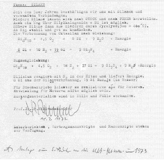 keinen Schaden. Erste Versuche entstehendes Si auszufiltern. (11c) R.Riemschneider “Silane as fuels“ (“Silane alsTreibstoffe”) Lecture, given in Aug.1980, Colloquium Central Inst.of Chemistry UFSM, (11d)