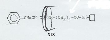 Key to Pl 7 - 9: Reaction of "semi-dumbbell" compound XV with β-2,6-dimethyl-cyclodextrin to XVIII [type I compound] (Fig 2): A suspension of 0.01 mol XV (Pl 7) in 75 ml tetrahydrofuran (THF) is treated with agitation with 0.01 mol β-2,6-dimethyl-cyclo-dextrin. Product XVIII obtained the next day after destilling off the solvent in vacuo is dried at 40oC. C70H115O38N (XV : cyclodextrin = 1:1) C calc 59.7% found 60.0% H calc 7.29% found 7.1% N calc 0.9% found 0.8% TLC: Rt value of XVIII at 0.15; of cyclodextrin: 0.63. - Merck TLC-plates IR: 1712 (C=O), 1650, 1528 amide bands; 1609: (C=C) 3280 - 3550: OH bands of β-2,6-dimethyl-cyclodextrin according to labreports; synthesis of XV described in (13) Synthesizing the"axis-ring" molecular aggregate XIX (Pl 7) [working with 0.001 mol quantities (1:1:1:1)]: ClCOOC2H5 is laced into the solution of XVIII from the above experiment and triethylamine in 100 ml THF at -20oC and caused to react after several hours of agitation with β-naphthylamine (or other bulky amines). After 48 hrs of agitation, processed to XIX by destilling off the solvent in vacuo and treating the residue with diethylether. C80H123O37N2 (XVIII : cyclodextrin = 1:1) C calc 56.3% found 56.0% H calc 7.2% found 7.4% N calc 1.6% found 1.5% TLC: Rt value of XIX 0.0; of cylodextrin: 0.62 IR: Amide bands 1655, 1532 Elimination of β-dimethyl-cyclodextrin from compounds XVIII and XIX by the action of amyloglucosidase: XVIII and XIX are treated with amyloglucosidase at 40oC in an incubator and processed after 48 hrs by adding water, destilling off, washing and drying in vacuo. The IR spectra of the reaction products obtained from XVIII and XIX indicates the lack of the cyclodextrin component. Plate 10: Synthesizing the “axis-ring” molecular aggregate V: Pathway I