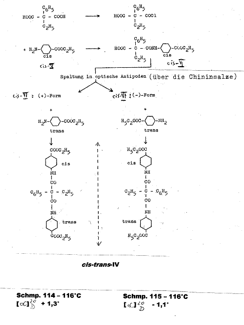 Symmetric, optically inactive cis-cis-IV was formed analogously from (+)-cis-VI and (-)-cis VI with cis-4-amino-cyclohexane-carboxylic acid diethyl ester. The in comparison with the racemic form significantly higher mp of the optical antipodes of cis-trans-diamide, whose mixed melting point was over 20o lower, was noteworthy, and further underpins our findings. Racemic cis-trans-IV mp 79 - 81oC. It was obtained from racemic trans-monoamide (trans-VI) and cis-V and from racemic cis-VI and trans-V. Mixed mp of both racemic cis-trans-IV preparations: 78 - 80oC. Further details and confirmational formulas for IV and precursors in Appendix. Example 3: 1-(cis-α-phenyl-cinnamoylamino-3-(trans-α-phenyl-cinnamoylamino)-2-methyl-2-n-propyl-propane [cis-trans-IX] (5, 6): Pl 5 a, b Plate 5a: Synthesizing 1-(cis-α-phenyl-cinnamoylamino-3-(trans-α-phenyl-cinnamoylamino)-2-methyl-2-n-propyl-propane (cis-trans-IX)