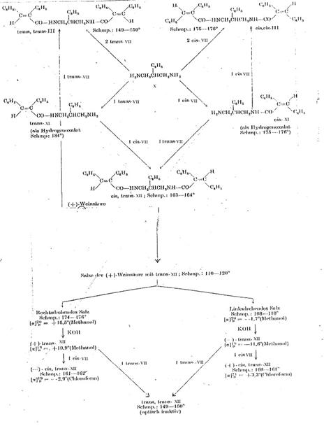 “Aufhänger” “Aufhänger” A and B were converted according to the so-called hanger-pendant principle. In the case of A in stages via monoacidchloride with cis- and trans-1,4-diamino-cyclohexane-carboxylic acid and in the case of B in stages with cis-trans-cinnamic acid chlorides: Examples 2 - 4, Pl 4 - 6. In all cases, care had to be taken from the outset that the synthesized compounds were projected in such a way that they permitted splitting into dextro and laevo components, so as to detect the expected optical activity. The four synthesized cis-trans asymmetrical compounds are listed in Pl 1, details in Pl 3 - 6 with keys; cf. also III Appendix. Example 1: 1-(cis-β-styryl)-1-(trans-β-styryl)-3-piperidino-propan-1-ol [cis-trans-I] (2a, b): Pl 3 The reasons for selecting Example 1 are: 1) The geometrically isomeric ligands are in maximum proximity to the centre of asymmetry (requirement of “Entfernungssatz”) 2) Optical activity by reason of steric hinderance is impossible, as observations of space-filling models (STUART and STUART-BRIEGLEB) show 3) Optically active phenyl and vinyl carbinols with considerable amounts of rotation, as described in the literature, led us to expect “sufficient” rotations for styryl carbinols Plate 3: Synthesizing 1-(cis-β-styryl)-1-(trans-β-styryl)-3-piperidino-propan-1-ol [cis-trans-I]