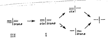UV and IR spectra as well as the change in optical rotation on taking up H2 upon hydrogentation from (-)-III to (-)-I, and via an intermediate stage on to --/-- were considered further proof: