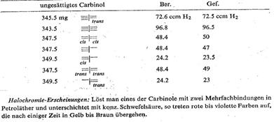 Halochromic effect: If one of the carbinols with two multiple bonds is dissolved in petroleum ether and sulphuric acid is added to form a lower layer, red to violet colours appear that change to yellow to brown after a while.