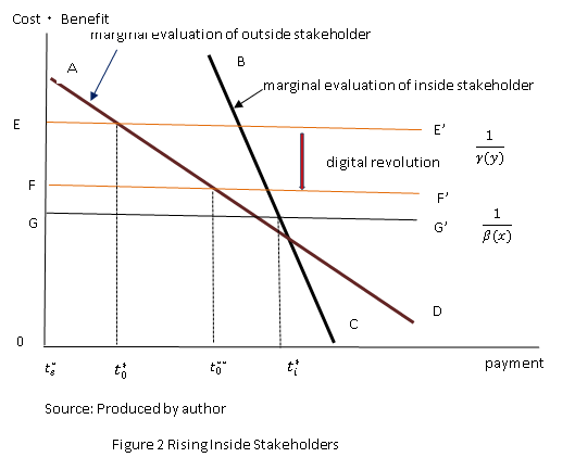 This paper is organized as follows. 2. expresses the structure of stakeholders to explore the digital economies. This section presents that digital revolution enlarges scope of the two way communication. This revolution is assumed to lower the transaction cost regarding outside stakeholder. 3. demonstrates that this revolution increases the total number of stakeholders and raises relative rate of outside stakeholder.