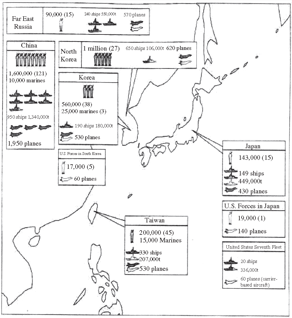 4. The figures in the brackets indicate the total number of basic military units, such as divisions and brigades. With North Korea, only divisions are reflected. With Taiwan, MPs are included.
