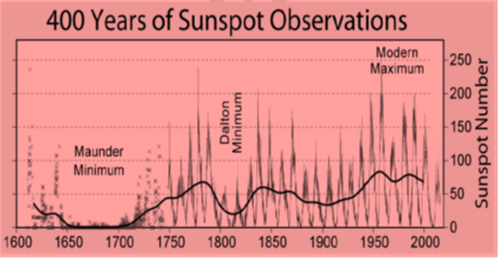 During the Maunder Minimum periods of low solar sunspot activity, there was also an increase in the ratio of radio-carbon 14 (14C to 12C) in tree rings and there were documented changes in the aurora borealis. Each of these periods was known for bitterly cold and prolonged winters in the Northern Hemisphere. The Maunder Minimum occurred during most of the 17th Century and the first decade of the 18th Century [7]. A later period of relatively low sunspot activity commenced in the last two decades of the 18th Century and lasted for the first three decades of the 19th Century. This period is known as the Dalton Minimum. The two grand minima were collectively called the (Little Ice-Age) [7].