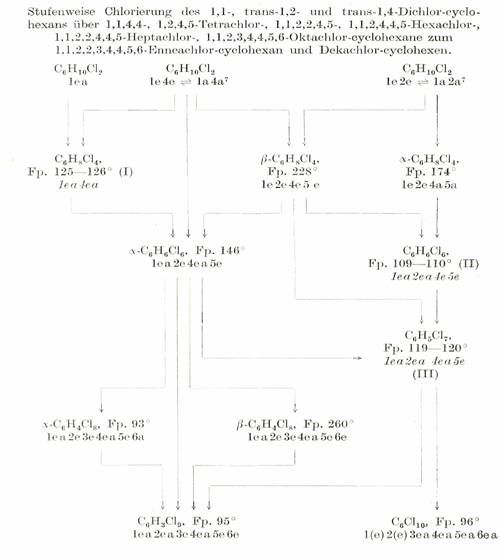 It is still lacking the eighth theoretically possible C6H6Cl6-isomer of the chair-configuration 1e2a3e4a5e6a. In case of realisation, it would be the theta-isomer. Of the 1,2-dibromo-3,4,5,6-hexachloro-cyclohexanes we isolated 4 isomers: PROJ IX in [1]. Table 2b: Cyclohexane chlorination products: "Cyclohexane family tree”* The products obtained in crystallised form from the chlorination of cyclohexane are preferably Cl-substituted in the positions 1,2,4,5, i.e. some CH2 groups remain intact in favour of the formation of CCl2 groups: Substitution products bearing Cl atoms on all C atoms were not obtained until the Cl number 8 was reached: Plate 4:
