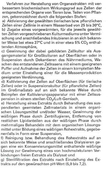 Plate 6: Claims of the patent EP 1 663 274 B1 1. A process for preparing placenta extracts of cereals, selected from the group consisting of wheat, rice, barley, rye, oats, sorghum (millet), triticale and spelt, from placenta cells of specifically prepared or commercially available placenta cell lines of the said cereals, characterized by the following steps: a) activation of the selected placenta cell line of one of the cereals, selected from the group consisting of wheat, rice, barley, rye, oats, sorghum (millet), triticale and spelt, in a water bath at a temperature of preferably from 25 to 30 °C, b) addition of a pre-_heated culture medium which is prescribed for the selected cell line by mixing it therewith and then incubating it in a manner known per se, preferably at a temperature of about 37 °C and preferably in an atmosphere containing about 5 % CO2, c) separating and using the obtained cells as starting material for mass cultures in suspension by decanting the culture medium, washing the produced cell mass with a suitable buffer and introducing the cells into a complete medium and adjusting a dilution which is suitable for the mass production,