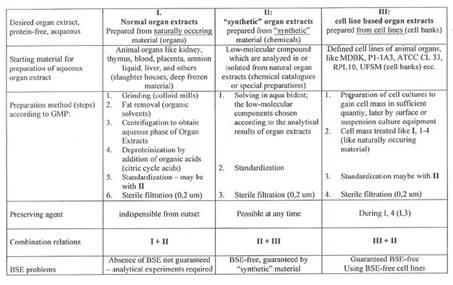 III Cell line based organ material beats BSE risk in animal organ extracts (2b). The author compares the properties of SWINE organ extract - prepared from BSE-free cell lines - with the properties of SWINE extract received from fresh organ glands and - with those of synthetic SWINE extract: Plate 2: The three manufacturing methods, Plate 3: Activity data of the three SWINE extracts. In the 60ies, the author prepared for the first time natural SWINE