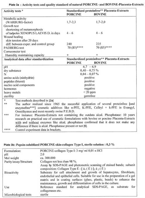 used in large scale in In December 2000 the import of any bovine material was stopped by Asian countries. Japanese customers changed to natural SWINE placenta extracts – in consequence of the author’s publication: of 2001, entitled “PORCINE based organ extracts guarantee full substitution of BOVINE extracts” (4b): The results, collected already in the 60ies and 70ies, are summarized in the following Plates 3a and 3b. Preparations based on natural SWINE organ material can be used in cosmetics and medicine as long as no prions are to be discovered in such material; but in case – the way out then would be to work with synthetic or cell line material.