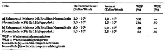 Preparations on the basis of Saccharomyces cerevisiae stimulate the growth of bacteria such as Lactobacillus and Bifidus species as well as of regular yeasts. Experimental data in Tab 3: