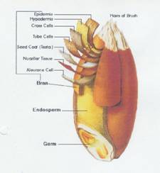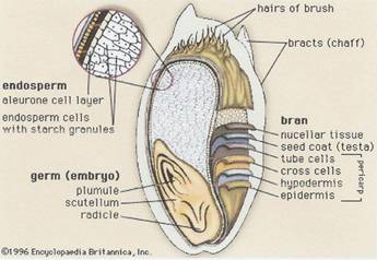 Key to illustrations 1a and b: The rye bran is the hard, browish outer protective skin of the grain; it surrounds the germ and the endosperm. The bran consists of seven layers which are a concentrated source of dietary fiber; the layers with placenta character are collected together with the aleurone cells. The inner part of the grain is the endosperm containing proteins and carbohydrates (from the endosperm the flour is produced). The germ contains the plant embryo.