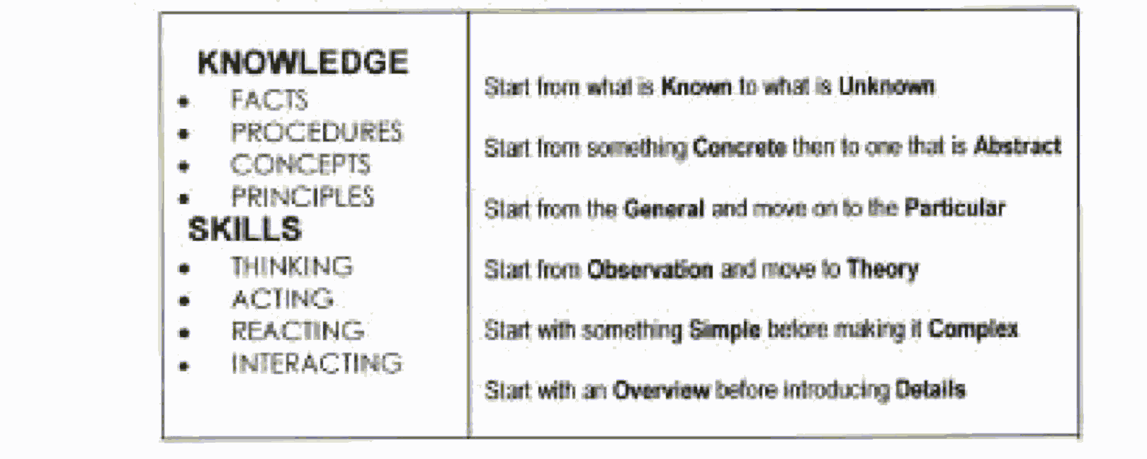 ![]() Diagram 4: Discretion cares needed during knowledge transfer Trainer has to use facts, procedures, concepts and principles for transferring knowledge; and thinking, acting, reacting and interacting mechanisms for transferring skills( Table 1). Here, trainer has to practice following modalities: (1) Start from what is Known to what is Unknown, (2) Start from something Concrete to one that is Abstract, (3) Start from the General and move on to the Particular, (4) Start from Observation and move to Theory, (5) Start with something Simple before making it Complex and (6) Start with an Overview before introducing Details.