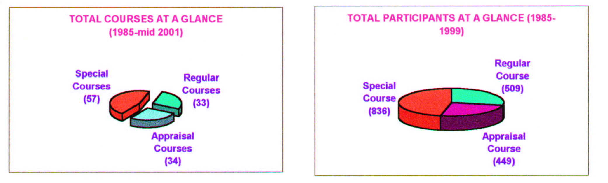 Training Statistics Total number of courses conducted during 1985 – mid 2001 are 132 and number of participants trained are 1936 and diagrams 5(a) and 5(b) give the respective pie diagrams giving distribution with reference