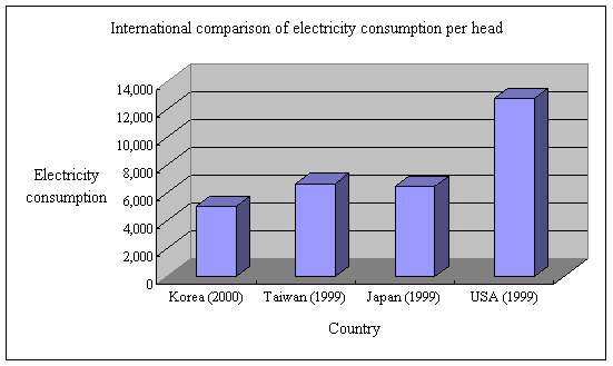 Reducing carbon dioxide emissions means a corresponding demand for reducing the use of fossil fuel. This demand is fatal to developing countries with industrial structures based on the use of low-quality fossil fuel. In contrast, the developed countries have wider room than developing countries in regard to combating global warming. Developed countries have escaped from heavy industry based on fossil fuel and have accumulated a considerable level of technology in environmental-industrial areas, and enjoy superior substitutive energy technology. Energy technology requires a long period for development. Gradual systematic improvement in technology rather than innovative technology can be more helpful for environmental preservation and energy savings. Especially, a city cannot be modified or completed within a short period and, therefore, a city must be constructed from the standpoint of energy. Above all, it is very important to plan a city or construct a building in such a way that energy savings and environmentally-friendliness are realized in terms of daily life within the city. A city concentrating human economic activities has a high population density, destroys the natural environment to create human residences and economic activities and shows a much higher energy consumption per area than in rural areas. If, however, several problems are solved in terms of energy consumption-to-population and energy consumption-to-production ratios, the city is very likely to transform itself into a low energy-consumption area. From the standpoint of energy, the high-rise apartment has favorable aspects in terms of an efficient application of energy systems, including waste-heat recovery systems, linked with the district heat supply system and other integrations of energy systems. The trend to high-rise buildings in cities will continue. Any country with a high population density (e.g.: Korea: 3rd place in the world) cannot avoid increasingly higher density in its cities. In fact, rural housing using natural materials or low-rise rural housing is better in terms of natural beauty and human health. However, present environmental problems caused by global warming and the exhaustion of natural resources, both of which are problems posed in terms of human survival rather than as improvements in human dwellings. Decisions relating to environment-friendliness require evaluation in terms of both natural resources and energy. The energy consumption of buildings, which accounts for 20% of total energy consumption, will show gradual increase due to the national demand for ‘more pleasant life’ coupled with a continuous population growth. Tighter energy savings policies, including instituting energy performance certifications for inducing competitive supply and expansion of energy-saving buildings, are necessary for reducing the energy consumption of building. Table 7: Electricity Consumption in Korea