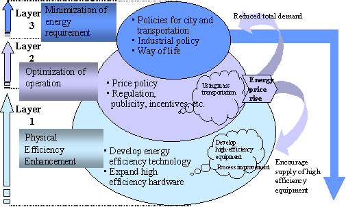 Layer 1 : Improve physical efficiency of hardware. Layer 2 : Policies inducing reasonable consumption by energy consumers, including price policy. Layer 3: Policies for minimizing total energy required by society in terms of industrial policy, city planning and way of life. In Germany energy consumption shows a large decline in accordance with the long-term energy scenario. The scenario assumes that energy consumption will decline each year through energy saving, thereby reducing annual energy consumption per capita to 1.64 oil tons. By 2010, German annual energy consumption per capita will decrease to about 3.7 tons. Also, Germany plans to appropriate about 0.4 tons of regenerated energy for a total energy consumption of 3.7 tons, and therefore, annual fossil energy consumption per capita will be reduced to 3.3 tons.