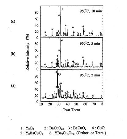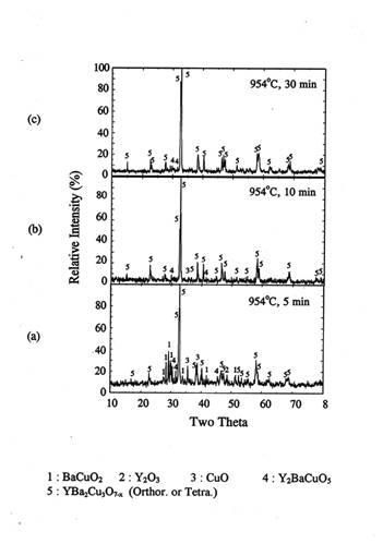 were remained as the major phase. After five minutes of reaction at 1020℃, orthorhombic Y123 was the
