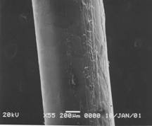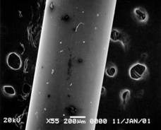 Joo1 Department of Chemical Engineering, 1Energy Conversion and Korea Institute of Energy Research, ABSTRACTEnvironmental remediation using photocatalyst has been the most intriguing issue in many countries for the past decade. While various research areas on photocatalysis have been studied, the immobilization of photocatalyst on a specific substrate, in particular, has attracted many researchers’ attention due to the versatility of application. In this article, plastic optical fibers(POFs) were considered as light-transmitting media and substrates for the potential use in photocatalytic environmental purification system, comparing with quartz optical fibers(QOFs). It is concluded that the use of POFs is preferred to QOFs since the advantages such as ease of handling, lower cost, relatively reasonable light attenuation at the wavelength of near 400 nm can be obtained. And also, this system has been identified to achieve two main goals; transfer of light and volumetric reaction among the various immobilized reactor system. 1. INTRODUCTIONThe incident light on one end of fiber transmits to the other end by total reflection if clad(made of fluorinated PMMA, F-PMMA) exists which has lower refractive index than core. Once the clad is peeled off and then photocatalyst is coated on the surface of the fiber, refracted light can be absorbed due to higher refractive index of photocatalyst than that of core material. The core of the optical fiber can be made of quartz or polymer(mostly polymethyl methacrylate, PMMA). The former has relatively lower light attenuation(102 ~ 1 dB/km at the range of 300 ~ 800 nm), but it is very difficult to handle and its cost is expensive. For this reason plastic optical fibers(POFs), which are inexpensive, flexible, resilient, tough, and weather resistant at temperature range of -55 ~ 70℃, were chosen to achieve the same goals of OF systems and resolve the aforementioned problems of the QOFs simultaneously. Using POFs in photocatalytic system can be promoted by the fact that the light attenuation difference hardly affects the reactivity in such a short length of transmittance and solar light and UV-A lamp in the absence of light < 300 nm does not degrade POFs’ core structurally. 2. EXPERIMENTALPretreatment of POFs could not be done either thermally or physically because the materials of core and clad is very similar to each other. Solvation using appropriate solvent was finally chosen to remove the clad of POF. After removing the clad from POF with 1 mm diameter, the resulted diameter should be close to 0.98 mm(matched with data by supplier). Clear proof of change in diameter of the POF was obtained by SEM (JSM 5900, JEOL) taken at various time scales(figure 1).