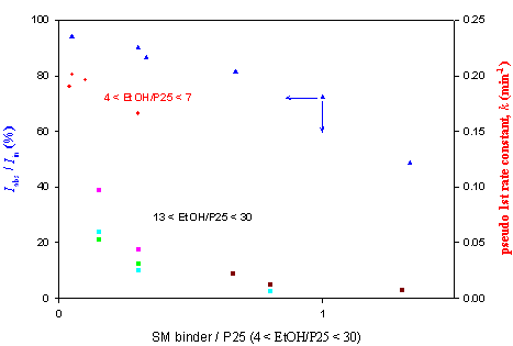 Fig. 2. Effect of added “SM” binder on light absorption and rate constant(iso-propanol 290 ppmv in 650 ml reactor). Selection of chemicals to