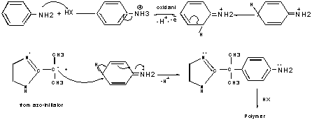 Scheme I. Proposed mechanism of Polymarization. 3.2. Morphology and Surface Resistivity The nature of particles of PANi composites and the surface resistivity of PET film coated by polyaniline are listed in Table 2. To obtain well dispersion in aqueous solution was the main goal of the present work. PANi/PVP/VA-044 composite is more stable than PANi/PVP composites. This may be, of course, due to H-bonding between (i) N-atom of VA-044 bonded with PANi chain and –NH- of another PANi chain or H-of protic solvent (ii) –NH groups of VA-044 attached with PANi chain and O-atom of PVP or solvent containing O-atoms (iii) –NH group of PANi chain and O-atom of PVP or solvent (eg. water, ethanol etc). However, the macroscopic precipitation of PANi/PVP is disappeared on stirring. Moreover, the PANi doped by H2SO4 is more dispersed than PANi doped by TSA or TSA and HBr. This is because two O-atoms of H2SO4 may form H-bond with –NH- group of PANi or H-atom of solvent.