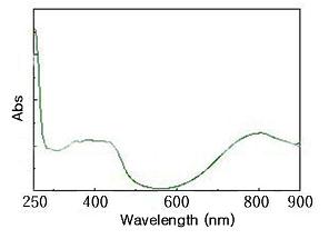 The UV-Vis spectra of PANi were taken without any purification. All UV-VIS spectra of PANi- (Emeraldine salt and Emeraldine base) were measured in water solution by adding one drop of original well dispersing sample to cuvette filled with distilled water. Electronic absorption spectra of the well dispersed PANi-2 in water is shown in Figure 3. The original PANi –dispersion was evaporated on a watch glass in drying oven for 1 hr at 100 o C. The broad band of 1.0 wt% aqueous solution at about 350 nm to 420 nm represents electronic transition (p®p*) of the benzoid ring. The band at about 800 nm is due to quinoid ring [11].