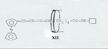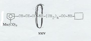 Key to Pl 7 - 9: Reaction of "semi-dumbbell" compound XV with β-2,6-dimethyl-cyclodextrin to XVIII [type I compound] (Fig 2): A suspension of 0.01 mol XV (Pl 7) in 75 ml tetrahydrofuran (THF) is treated with agitation with 0.01 mol β-2,6-dimethyl-cyclo-dextrin. Product XVIII obtained the next day after destilling off the solvent in vacuo is dried at 40oC. C70H115O38N (XV : cyclodextrin = 1:1) C calc 59.7% found 60.0% H calc 7.29% found 7.1% N calc 0.9% found 0.8% TLC: Rt value of XVIII at 0.15; of cyclodextrin: 0.63. - Merck TLC-plates IR: 1712 (C=O), 1650, 1528 amide bands; 1609: (C=C) 3280 - 3550: OH bands of β-2,6-dimethyl-cyclodextrin according to labreports; synthesis of XV described in (13) Synthesizing the"axis-ring" molecular aggregate XIX (Pl 7) [working with 0.001 mol quantities (1:1:1:1)]: ClCOOC2H5 is laced into the solution of XVIII from the above experiment and triethylamine in 100 ml THF at -20oC and caused to react after several hours of agitation with β-naphthylamine (or other bulky amines). After 48 hrs of agitation, processed to XIX by destilling off the solvent in vacuo and treating the residue with diethylether. C80H123O37N2 (XVIII : cyclodextrin = 1:1) C calc 56.3% found 56.0% H calc 7.2% found 7.4% N calc 1.6% found 1.5% TLC: Rt value of XIX 0.0; of cylodextrin: 0.62 IR: Amide bands 1655, 1532 Elimination of β-dimethyl-cyclodextrin from compounds XVIII and XIX by the action of amyloglucosidase: XVIII and XIX are treated with amyloglucosidase at 40oC in an incubator and processed after 48 hrs by adding water, destilling off, washing and drying in vacuo. The IR spectra of the reaction products obtained from XVIII and XIX indicates the lack of the cyclodextrin component. Plate 10: Synthesizing the “axis-ring” molecular aggregate V: Pathway I