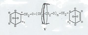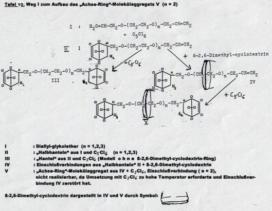 Key to Pl 10: As noted above, the pathway taken here had to be broken off in the last stage, ie the synthesis of V from IV, as the reaction temperature necessary for "closing" the "semi-dumbbell" cyclodextrin inclusion compound caused "decomplexation" of compound IV. The bis-alkyl ethylene glycol synthesized with Koetzsch, and its mono- and di-adducts with hexachlorocyclopentadiene, are described at (15). The complexations of the monoadducts with β-2,6-dimethyl-cyclodextrin and its γ-analogues was carried out as described in the key to Pl 7. Comparison of properties of "dumbbell" molecule XIX with ring and "dumbbell" XVI without ring (Pl 7): Solubility in CHCl3: XIX soluble, XVI slightly HPLC retention times: XVI greater than XIX IR spectra (OH valence): XIX positive, XVI negative Unexpectedly for us, XIX was remarkably stable, even in solutions like ethyl ester acetate, CHCl3 and methanol/H2O (HPLC) and only dissociates on warming in components ring/axis. All the compounds and aggregates dealt with in Pl 7 - 9 were synthesized