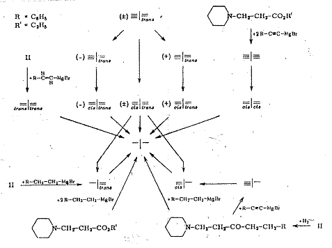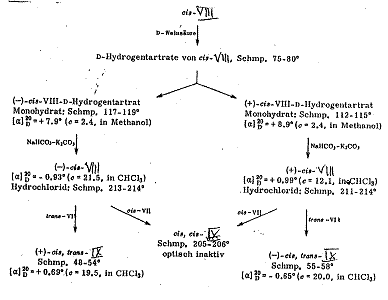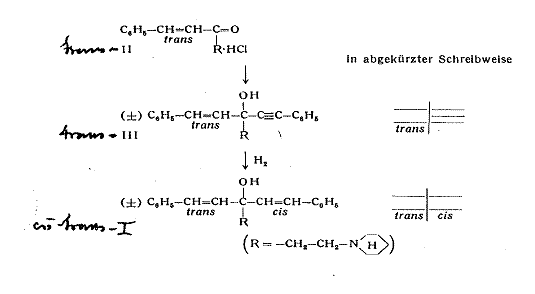 “Aufhänger” “Aufhänger” A and B were converted according to the so-called hanger-pendant principle. In the case of A in stages via monoacidchloride with cis- and trans-1,4-diamino-cyclohexane-carboxylic acid and in the case of B in stages with cis-trans-cinnamic acid chlorides: Examples 2 - 4, Pl 4 - 6. In all cases, care had to be taken from the outset that the synthesized compounds were projected in such a way that they permitted splitting into dextro and laevo components, so as to detect the expected optical activity. The four synthesized cis-trans asymmetrical compounds are listed in Pl 1, details in Pl 3 - 6 with keys; cf. also III Appendix. Example 1: 1-(cis-β-styryl)-1-(trans-β-styryl)-3-piperidino-propan-1-ol [cis-trans-I] (2a, b): Pl 3 The reasons for selecting Example 1 are: 1) The geometrically isomeric ligands are in maximum proximity to the centre of asymmetry (requirement of “Entfernungssatz”) 2) Optical activity by reason of steric hinderance is impossible, as observations of space-filling models (STUART and STUART-BRIEGLEB) show 3) Optically active phenyl and vinyl carbinols with considerable amounts of rotation, as described in the literature, led us to expect “sufficient” rotations for styryl carbinols Plate 3: Synthesizing 1-(cis-β-styryl)-1-(trans-β-styryl)-3-piperidino-propan-1-ol [cis-trans-I]