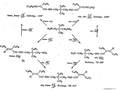 Symmetric, optically inactive cis-cis-IV was formed analogously from (+)-cis-VI and (-)-cis VI with cis-4-amino-cyclohexane-carboxylic acid diethyl ester. The in comparison with the racemic form significantly higher mp of the optical antipodes of cis-trans-diamide, whose mixed melting point was over 20o lower, was noteworthy, and further underpins our findings. Racemic cis-trans-IV mp 79 - 81oC. It was obtained from racemic trans-monoamide (trans-VI) and cis-V and from racemic cis-VI and trans-V. Mixed mp of both racemic cis-trans-IV preparations: 78 - 80oC. Further details and confirmational formulas for IV and precursors in Appendix. Example 3: 1-(cis-α-phenyl-cinnamoylamino-3-(trans-α-phenyl-cinnamoylamino)-2-methyl-2-n-propyl-propane [cis-trans-IX] (5, 6): Pl 5 a, b Plate 5a: Synthesizing 1-(cis-α-phenyl-cinnamoylamino-3-(trans-α-phenyl-cinnamoylamino)-2-methyl-2-n-propyl-propane (cis-trans-IX)