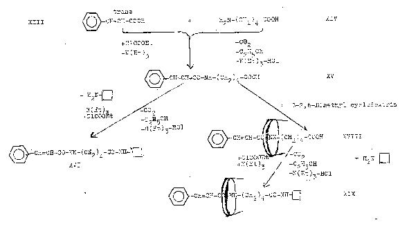 Key to Pl 4: The monochloride obtained by boiling ethyl-phenyl-malonic acid and SOCl2 in diethyl ether for 12 hrs was converted with cis-4-amino-cyclohexan-carboxylic acid-diethyl ether (cis-V) in the presence of triethylamine in CHCl3 at 0oC to racemic ethylphenyl-malonicacid-mono-(cis-4-carbethoxy-cyclohexylamide) (cis-VI). The antipodes from racemic cis-VI were seperated using their quinine salts in ethyl acetate, from which (-)-cis-VI and (+)-cis-VI were obtained. When acted on by p-nitrophenol and N,N-dicyclohexyl-carbodiimide,