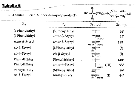 oily fraction cis=I=trans showed [α] An oil is formed in like manner from carefully purified (+)-1-[trans-β-styryl]-1-phenylethinyl-3-peperidino-propan-1-ol: Combining the two antipodes: If the two optically active oils obtained above are mixed 1:1, the mixture crystallizes after a while. The crystals formed (m p 64oC) are (per mixed sample) identical with the cis=I=trans obtained by hydrogenation from inactive 1-[trans-β-styryl]-1-phenylethinyl-3-peperidino-propan-1-ol. The following stereoisomers were synthesized to check the configuration and constitution of compounds summarized in Tab 6 and Pl 11. All the compounds described could be returned to the common saturated parent substance from b p 76oC by hydrogenation: Plate 11: Hydroderivatives, dehydroderivatives and isomers from cis=I=trans-I (table 6)