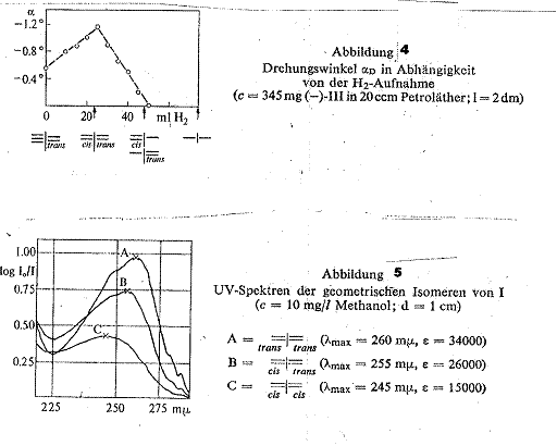 Steric assignation of the two double bonds: the three isomers of I took the same quantity of H2 up on hydrogenation and resulted in the same –I– ; the m ps differ considerably; the UV spectra behaved as expected: fig 4 and 5