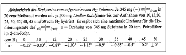 To conclude, a report on the total hydrogenation of active ≡ I= (III) focusing on the rotation: If the rotation is plotted against the H2 take-up (Tab 7), a curve is obtained which rises until a take-up of 1 mol H2 and falls back to zero on taking up a further mol H2. We had expected that the rotation would only fall back to zero on taking up three mol H2. We believe an explanation for this early disappearance of the rotation may be that cis =I – and –I = trans with opposite rotations form and exactly compensate each other. The curve speaks for the formation of cis=I=trans (2b).