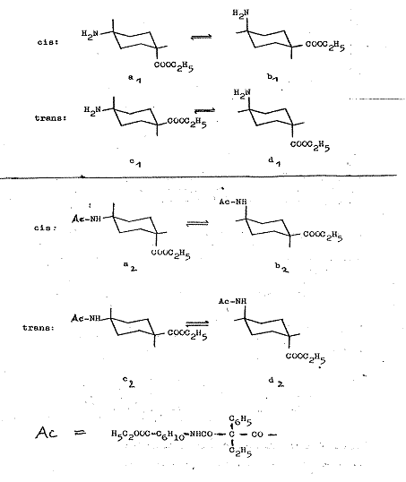 Key to Pl 12: The conformations a1 and b1 with equatorial amino groups and axial carbethoxy group, or vice versa, is the consequence for the cis form of VI, whilst both functional groups can be present in equatorial (c1) or axial (d1) position in the trans form; PROJ. XIX and IX in (1). Generally, type a and b or c and d conformations are respectively in equilibrium as "body" and "counterbody", but only a few kcal/mol are needed for reciprocal reaction, so it is impossible to isolate them with conventional chemical methods. These general regularities do not, however, preclude the following electrostatic interactions or particular steric conditions tipping the equilibrium substantially, even towards an unfavoured conformation in the presence of polar groups. If one now considers the bis-(cis- and trans-4-carbethoxycyclo-hexamide) and the cis-trans-bis-(4-carbehoxycyclohexyl-amide) of ethyl-phenyl-malonic acid, the pendant (as the N-acyl derivative of 4-aminocyclo-hexane-carboxylic acid in cis- and in trans form) has a mainly a2 and c2 conformation in which the acylated NH2 group is the largest substituent in the sterically favoured equatorial position. IV Bibliography: The list is very detailed to acknowledge the services of numerous colleagues and institutions. (1) R Riemschneider Re-reading 66 years of chemistry: 26 projects and over 1400 references (in prep) Ref here to PROJ II.3: cis-trans Asymmetry (1a, b, c, e) and PROJ II.7: Axis-ring molecular aggregates (1b, c, d, f). Cf also other PROJs (1a) R Riemschneider "Degree