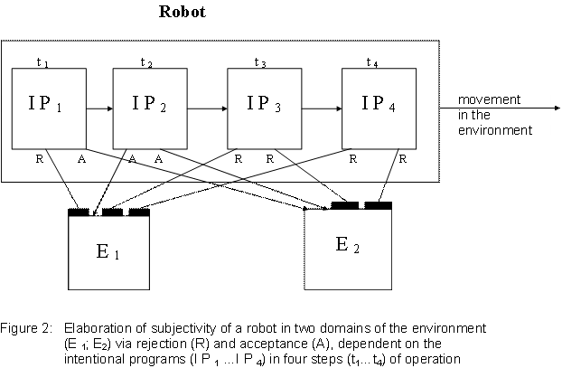 Fig. 2 represents a schematic diagram of a robot that stepwise elaborates its subjectivity. In a distinct operation procedure (t1…t4), the perception system generates four intentional programs (IP1…IP4). Since the robot is moving in an environment, the domains of the environment are changing (E1…E4). In the time periods (t1…t4) four intentional programs (IP1…IP4) are generated. The robot has to compute information of two different environmental domains (E1; E2). It operates according to the logic of acceptance (A) and rejection (R). IP1 rejects E1 and accepts E2. IP2 accepts both E1 and E2. In contrast, IP3 and IP4 reject both environmental domains (E1; E2). This example shows that the interaction of the robot with the environment is rather restrictive, since its intentions may be realized in other domains of the environment that have to be explored further. Such “self-determined” behavior of one robot could be interpreted by an observer as subjective. In any case, according to the logic of subjectivity proposed, this example demonstrates that the rejection behavior dominates the acceptance behavior. Finally, one should differentiate between a predominantly biomimetic behavior and a distinct subjective behavior of a robot. In other words: an animal-like behavior is not necessary a subjective behavior. Therefore, I propose to use subjective and human-like synonymously. Admittedly, then we are faced with difficult problems like consciousness and free will. However, this is not the topic of the present paper (see Mitterauer, 1998; 2000; 2006). Here, merely an attempt is made to propose two basic principles of subjective (human) systems, namely intention and rejection. FUTURE PROSPECTS Perhaps one of the greatest breakthroughs in robotics has been achieved by Bongard and co-workers last year. A four-legged machine uses activation-sensation relationships to indirectly infer its own structure, and it then uses this self-model to generate forward locomotion. When a leg part is removed, the machine adapts this self-model, leading to the generation of alternative gaits. The researchers conclude that this concept may help develop more robot machines and shed light on self-modelling in animals. In a commentary, Adami (2006) over-interpreted this self-modelling robotic system. He even speaks of a test bed for models of self-awareness. However, we should be cautious to relate this self-modelling mechanism to consciousness or self-consciousness. In addition, we should be aware that brain research is in a stalemate what the exploration of consciousness or self-consciousness concerns. I am afraid that this situation will not significantly change. As I mentioned, over the years only robotics may improve this situation. The paper presented here is a modest attempt to propose basic principles of subjectivity for robotics. It is also biomimetic, since it is based on a brain model. If it is possible – and I am convinced it is – to implement intentional programming and the logic of acceptance and rejection in a robot brain, then it may show a “touch” of subjective behavior. Since subjectivity connotes emotion, free decision processes and consciousness, the behavior of these robots will teach us if we have really implemented subjectivity. Moreover, since subjective human behavior is characterized by the capability to actively change the environment, the optimization techniques of subjective robots could reach a stage where they are also able to actively change their environments and robot-man interactions. Then ethics enter the picture. That is presently science fiction. However, since my model of subjectivity is formally based (Pfalzgraf & Mitterauer, 2005), it may be a good science fiction, becoming reality in this or the next century (Mitterauer, 1989). REFERENCES Adami C. (2006). What do robots dream of? Science 314: 1093-94. Bongard J., Zykov V., Lipson H. (2006). Resilient machines through continuous self-modelling. Science 314: 1118-21. Gates W.H. (2007=. Roboter für jedermann. Spektrum der Wissenschaft 3: 36-45. Günther, G. (1962). Cybernetic ontology and transjunctional operations.