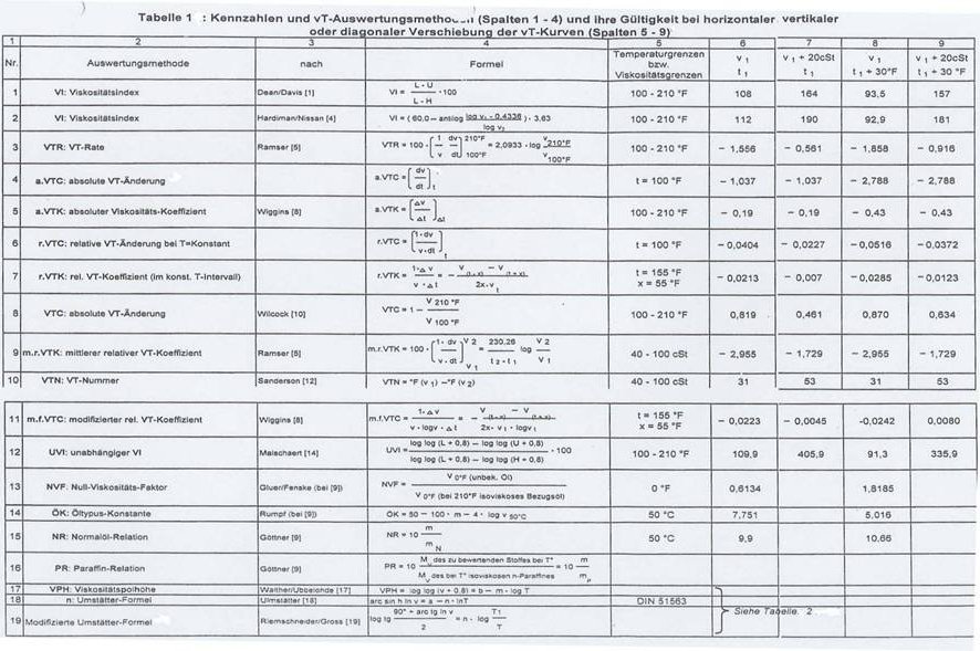 (33), starting from the UMSTÄTTER equation The editors I In connection with the author's own investigations into suitability tests for synthetic compounds with lubricating-oil character, the topic of "indices for rating their vT dependence" acquired particular importance. He had already recognized in 1943-51 that the formulas for vT assessment, derived from and related to practice - listed in Tab 1 (col 2, 3, 4 and dealt with in more detail in Sect III) - could not be considered adequate, above all when it was a question of systematic investigations into the influence of chemical structural characteristics on physical properties, eg investigations into "constitution and physical properties of hydrocarbons, ethers and esters" (40). A new approach for vT rating was needed. The author considered the possibility of assessing the vT behaviour