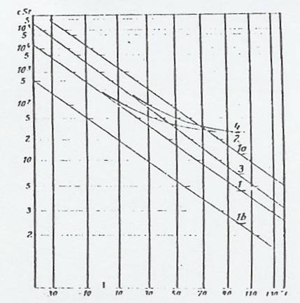 but uses different temperature limits. The same applies for it as was put forward for RAMSER's vT rate (5). Its advantages are that is easy to calculate and that it is independent of empirical formulas. Its viscosity-dependence and the choice of constant temperature limits are disadvantageous. This is the reason why the values for curves with the same profile but different altitudes differ, once again, as can be seen in Tab 1, ser no 8, col 5 - 9. So forgo using it. The paraffin relation: PR [Tab 1, ser no 16] as well as the normal oil relation: NR [Tab 1, ser no 15] are relative vT indices, proposed by GÖTTNER (9). They are based on an empirical reference series, namely the n-paraffins and a normal oil series, and require the use of a formula on the vT dependency. They are easy to calculate using the WALTHER-UBBELOHDE equation and the formula for normal oil [mN = 4,3 – 0,43 ∙ log v50]. They do, however, provide differing values for curves with the same profile but different altitudes, as the example of the normal oil relation shows: Tab 1, ser no 15/16, col 5 - 6. So these vT indices should not be used. Two relative indices deserve mention here. The first is the zero viscosity factor (Null-Viskositäts-Faktor): NVF [Tab 1, ser no 13], put forward by Mc'GLUER and FENSKE (13) and the second is oil type constant (Öltypus-Konstante): ÖK [Tab 1, ser no 14], developed by RUMPF (14). Both indices are based on empirical reference series and use the WALTHER-UBBELOHDE equation as a calculating aid, which is disadvantageous and restricts the range the method can be applied to. In addition, both indices provide differing values for curves with the same profile but different altitudes, as can be seen in Tab 1, ser no 13, 14, col 5-8 and again must be reduced to a choice of constant temperature limits, making them unsuitable for evaluating. One of the most important measures for vT behaviour in use in It is easy to determine. Determination can be by graph from the viscogram according to UMSTÄTTER (18) or by calculating from two vT values, more simply by using the modified UMSTÄTTER equation of RIEMSCHNEIDER and GROSS: Tab 1, ser no 19. These n-values have the same value for the whole curve, ie they are independent of the vT value pairs used for the calculation. But they are based on the use of an empirical formula, which restricts their use to the range the formula covers, in this case down to about 1 cSt. The UMSTÄTTER steepnesses for curves 1 and 3, which satisfy the UMSTÄTTER equation, were plotted in Tab 4a. It is apparent that the n-values differ for the two curves, that have the same profile but different altitudes. So this evaluation method does not give correct, accurate results. In addition, curves (1a and 1b) with the same steepness as 1 but different altitudes are plotted in Tab 4a, as Fig 2 shows. All three curves (1, 1a and 1b) have different profiles according to the evaluation method to be discussed below. Table 4a: Values calculted with UMSTÄTTER equation, Tab 1 ser no 19 Kurve n